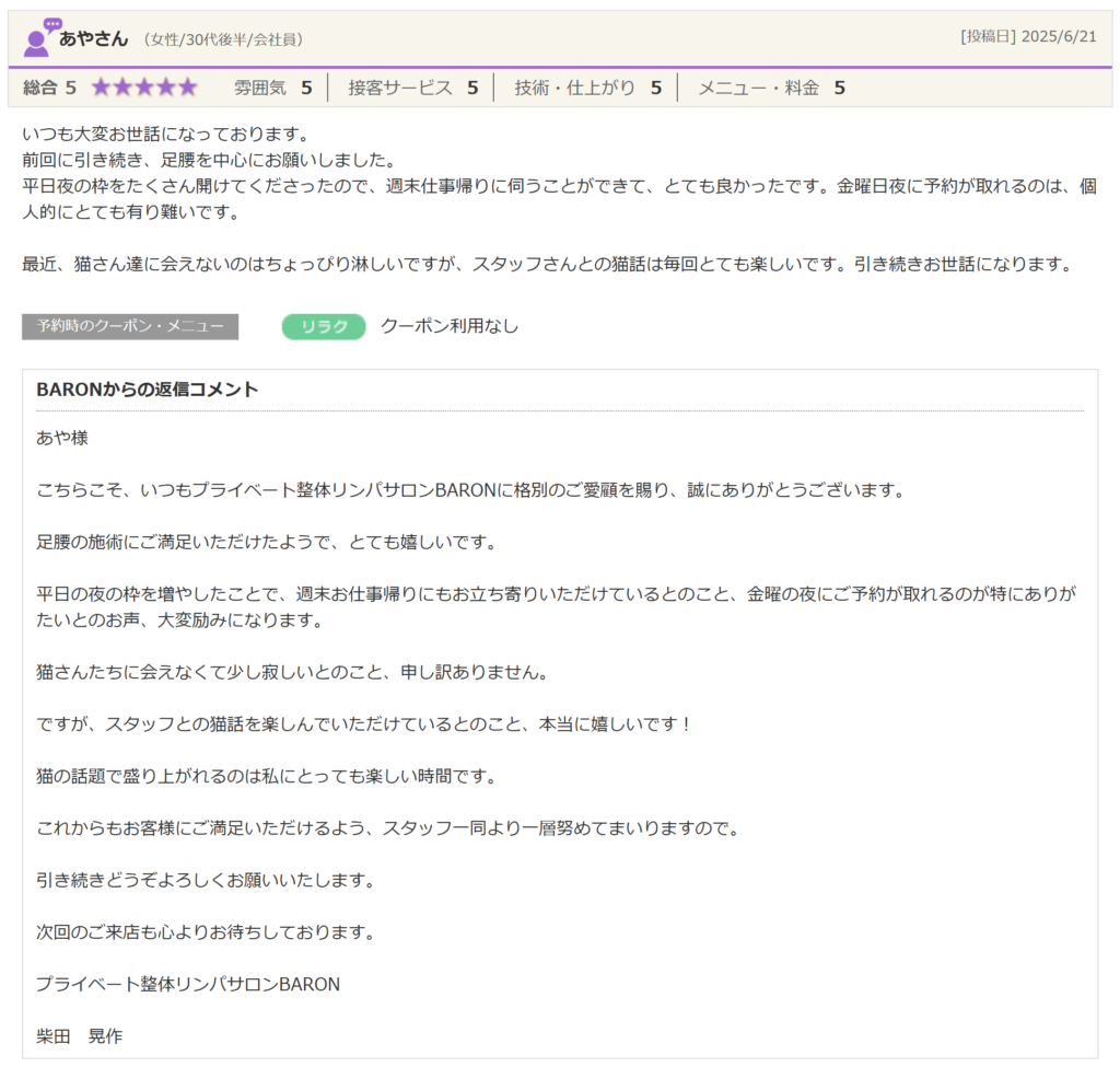 こちらこそ、いつもプライベート整体リンパサロンBARONに格別のご愛顧を賜り、誠にありがとうございます。