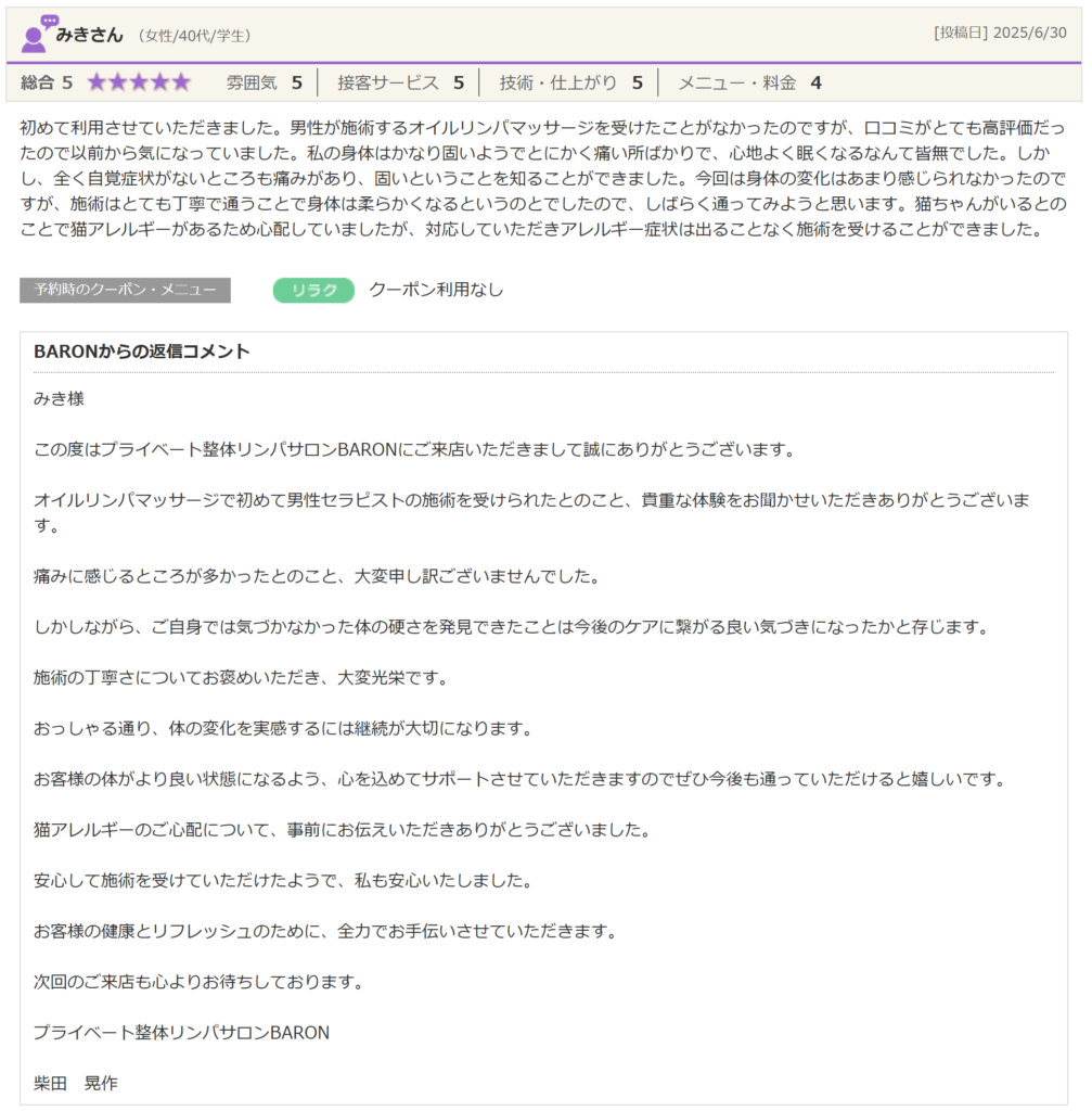 オイルリンパマッサージで初めて男性セラピストの施術を受けられたとのこと、貴重な体験をお聞かせいただきありがとうございます。